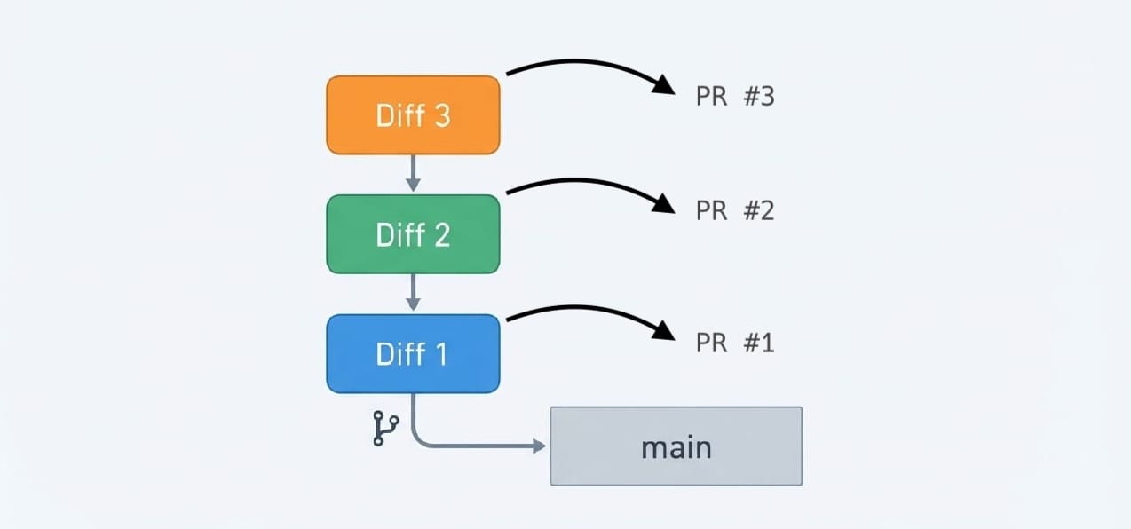 Stacked diffs (also known as stacked PRs or stacked changes) is a workflow where you break down a large feature into multiple small, dependent commits. Each commit becomes its own Pull Request, and they form a chain — Diff 2 depends on Diff 1, Diff 3 depends on Diff 2, and so on.